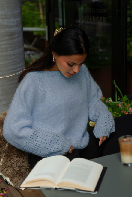 NB! Hele genseren strikkes med dobbel tråd. 1 tråd Bliss og 1 tråd Kid Mohair.