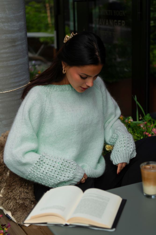 NB! Hele genseren strikkes med dobbel tråd. 1 tråd Bliss og 1 tråd Kid Mohair.