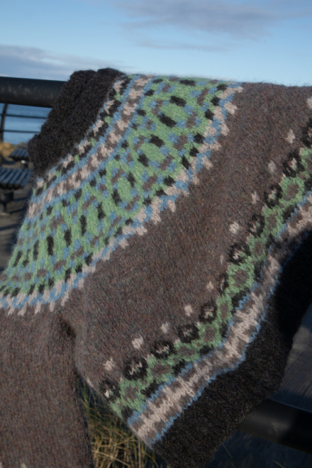16 m x 20 omganger glattstrikk og mønster på p nr 4,5 = 10 x 10 cm