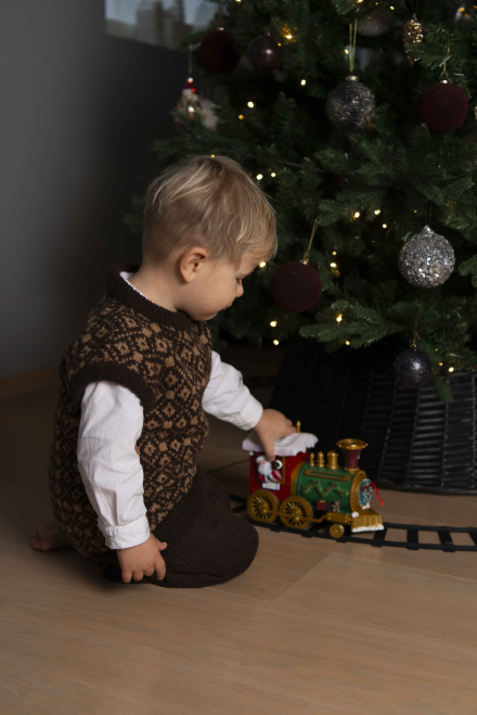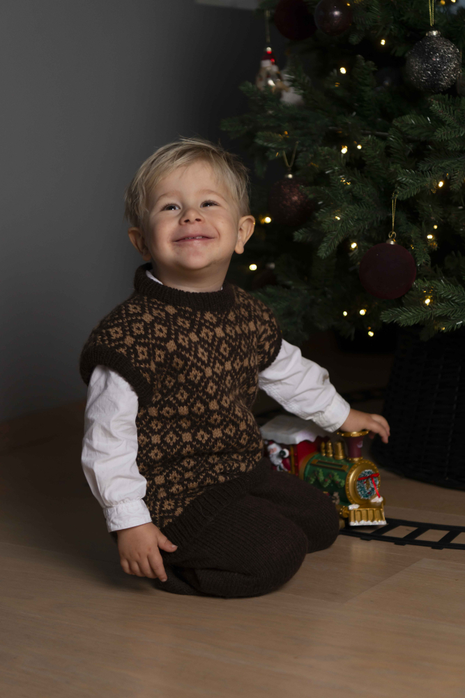 Du kan selv endre farge i strikkepakken ; velg da først størrelsen du ønsker å strikke, så kommer det opp fargevalg nedenfor. NB! Oppskrift vil alltid leveres i strikkepakkens originale farge: Mørk Brun og Kamel