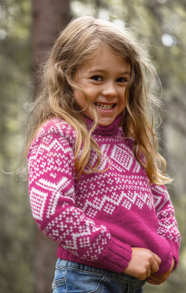 Du kan selv endre farge i strikkepakken ; velg da først størrelsen du ønsker å strikke, så kommer det opp fargevalg nedenfor. NB! Oppskrift vil alltid leveres i strikkepakkens originale farge: Pink og Hvit