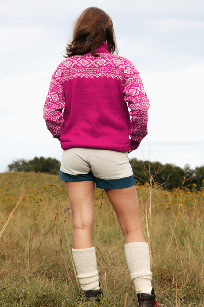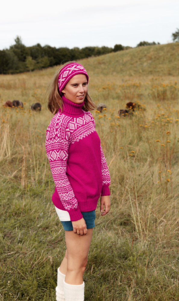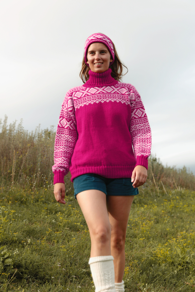 Du kan selv endre farge i strikkepakken ; velg da først størrelsen du ønsker å strikke, så kommer det opp fargevalg nedenfor. NB! Oppskrift vil alltid leveres i strikkepakkens originale farge: Pink og Hvit