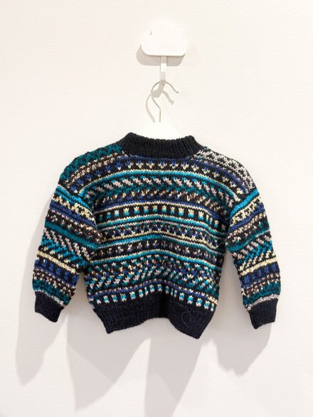 Du kan selv endre farge i strikkepakken ; velg da først størrelsen du ønsker å strikke, så kommer det opp fargevalg nedenfor. NB! Oppskrift vil alltid leveres i strikkepakkens originale farger: Mørk Indigo og Aqua/Blålilla Print