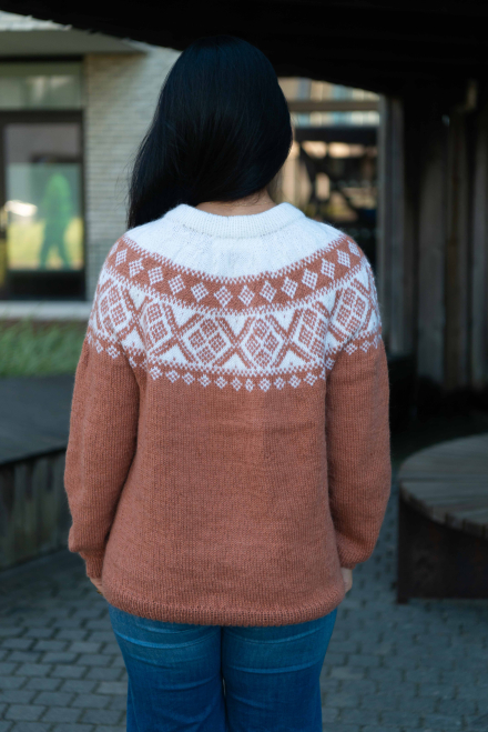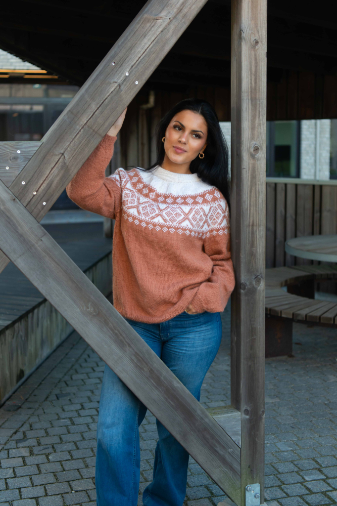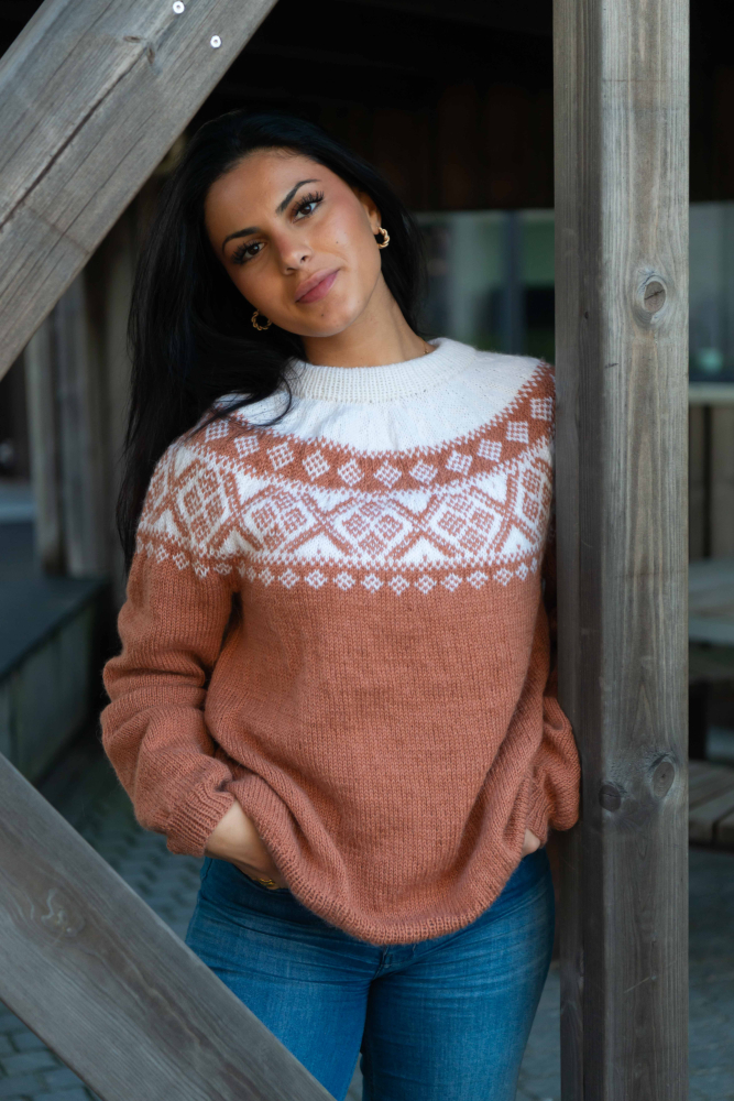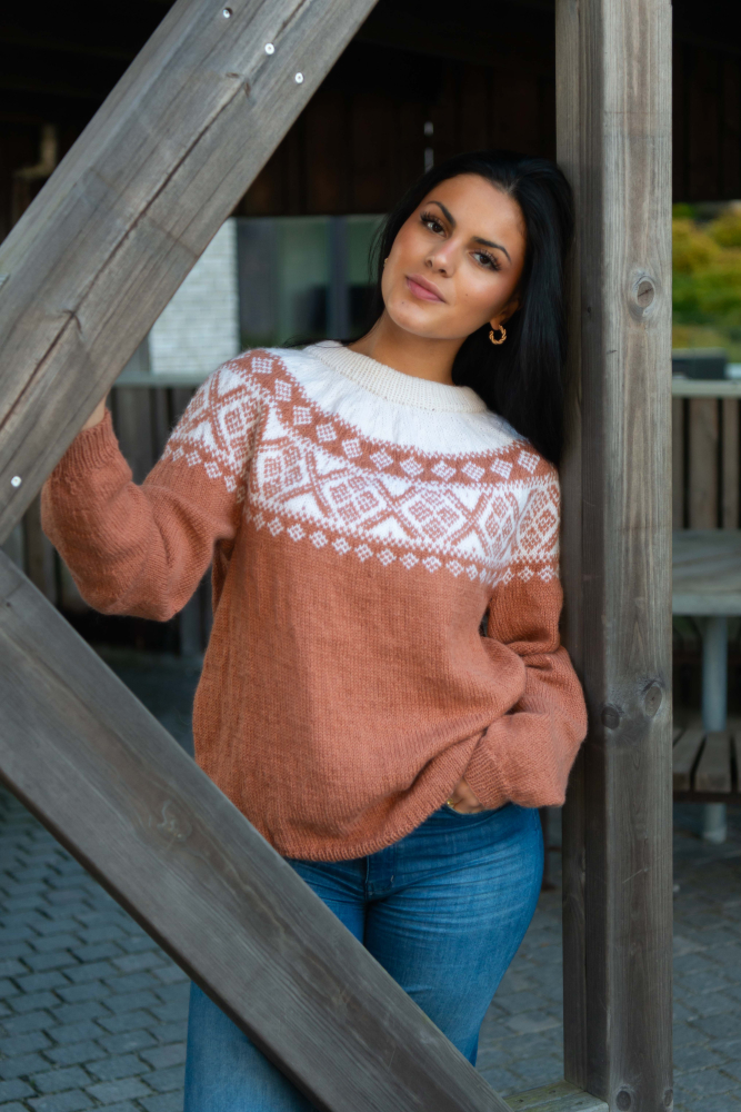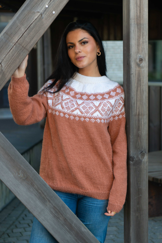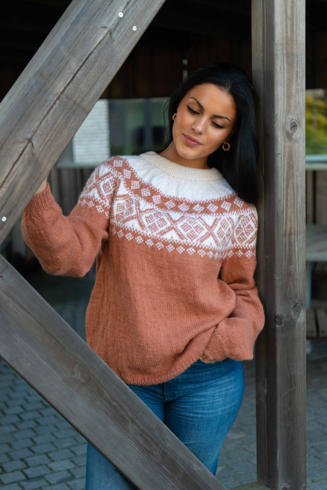 Du kan selv endre farge i strikkepakken ; velg da først størrelsen du ønsker å strikke, så kommer det opp fargevalg nedenfor. NB! Oppskrift vil alltid leveres i strikkepakkens originale farger: Dus Aprikos og Offwhite