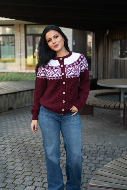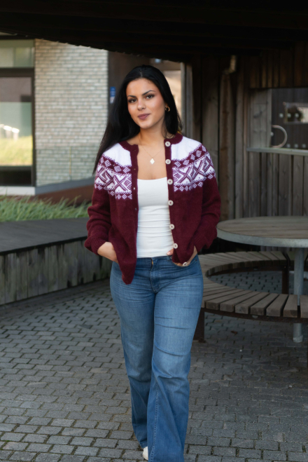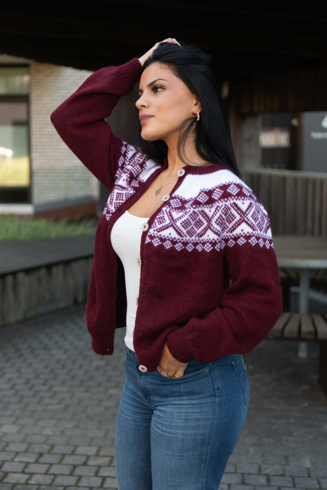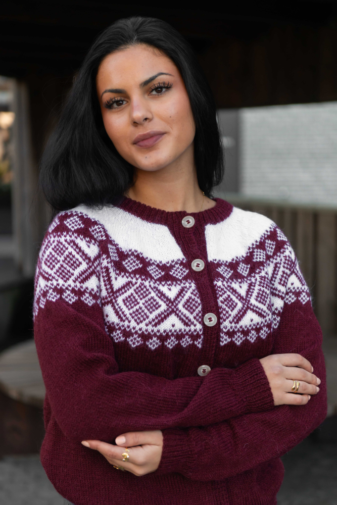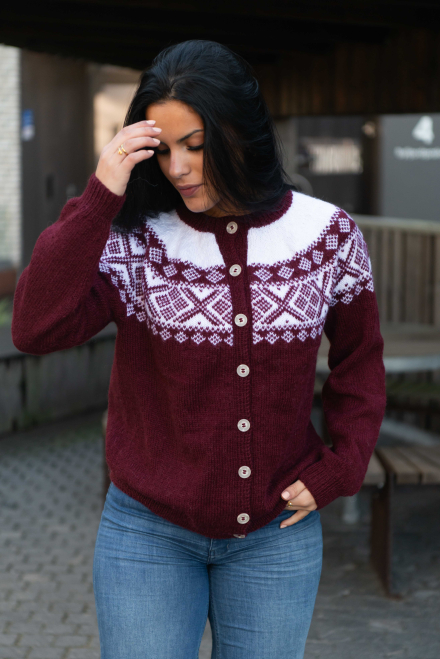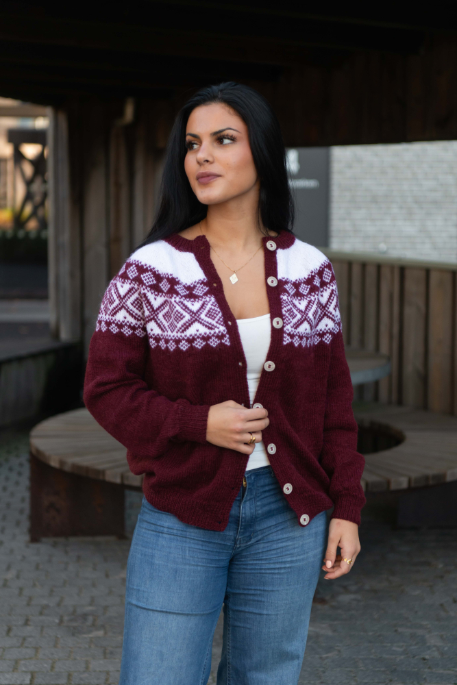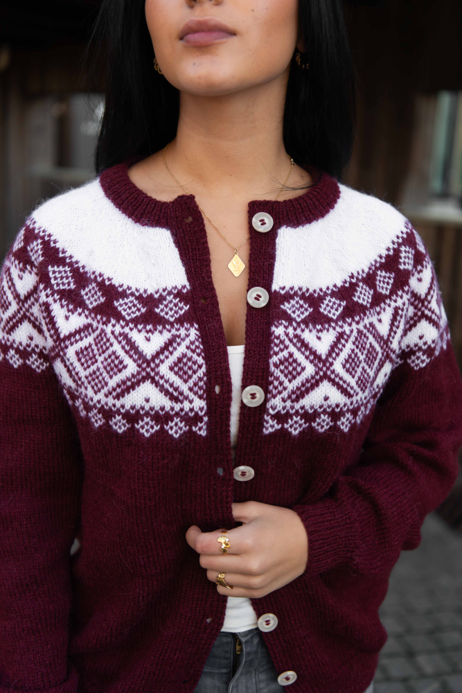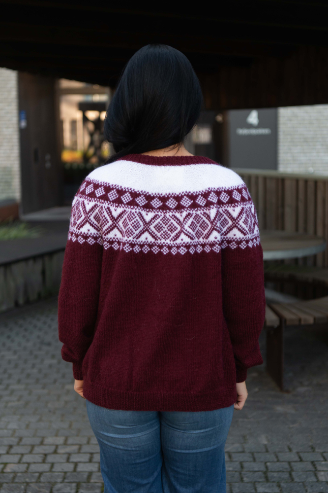 Du kan selv endre farge i strikkepakken ; velg da først størrelsen du ønsker å strikke, så kommer det opp fargevalg nedenfor. NB! Oppskrift vil alltid leveres i strikkepakkens originale farge: Bordeaux og Hvit