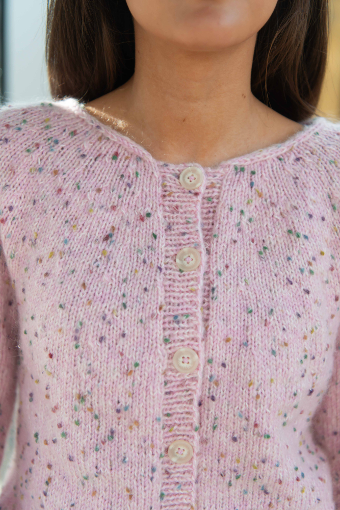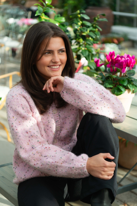 Du kan selv endre farge i strikkepakken ; velg da først størrelsen du ønsker å strikke, så kommer det opp fargevalg nedenfor. NB! Oppskrift vil alltid leveres i strikkepakkens originale farge: Rosa Tåke og Lys Rosa