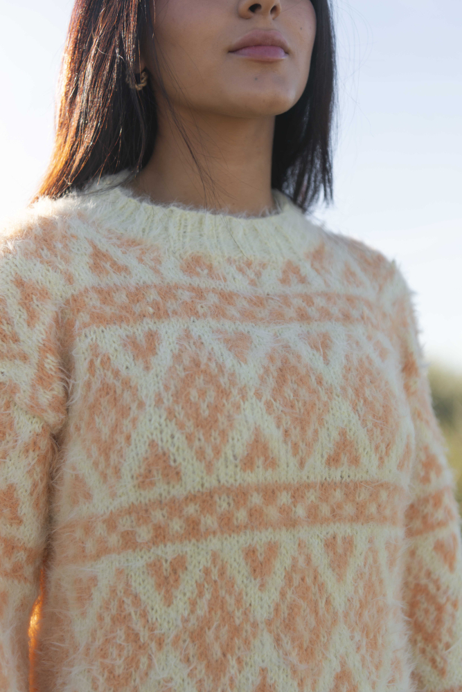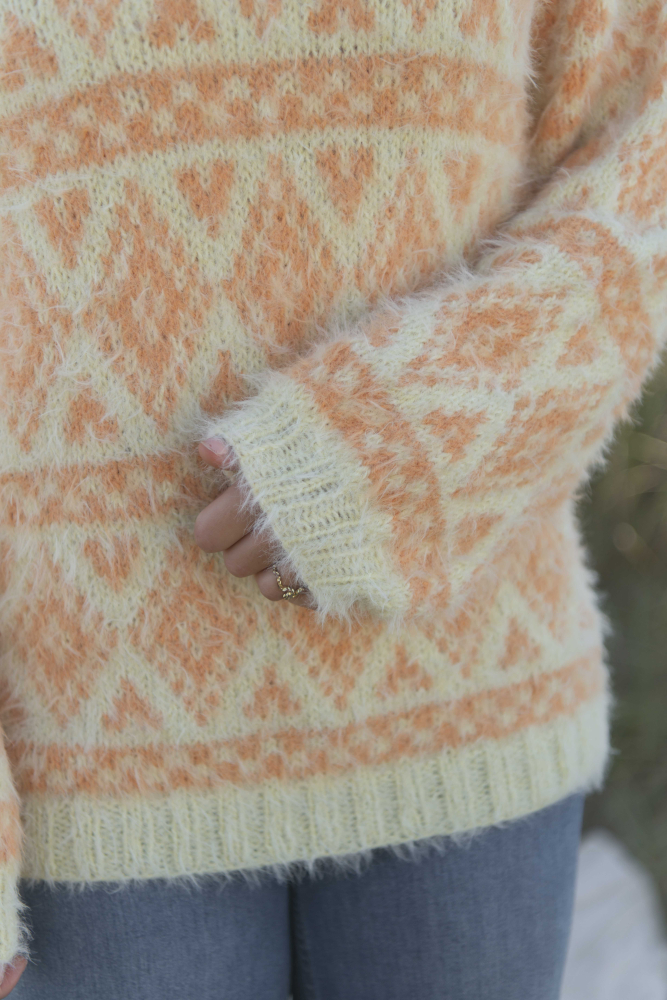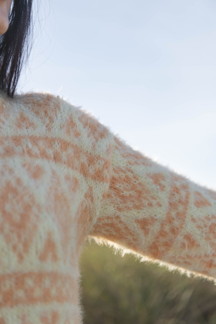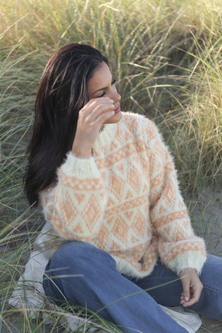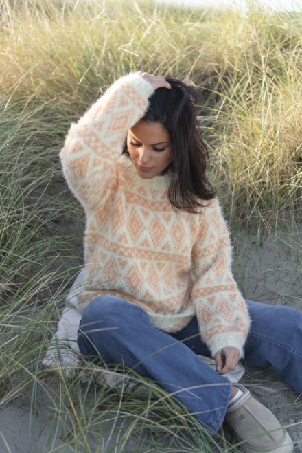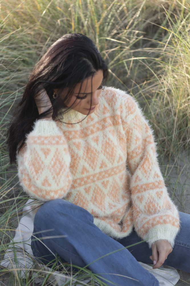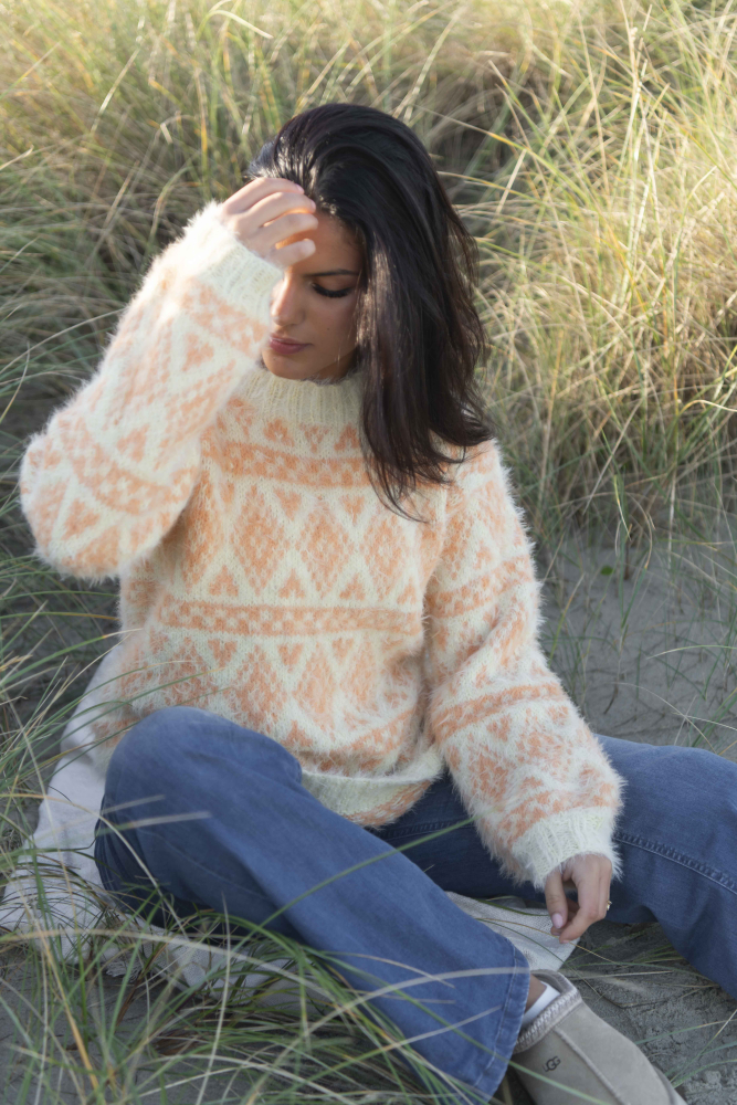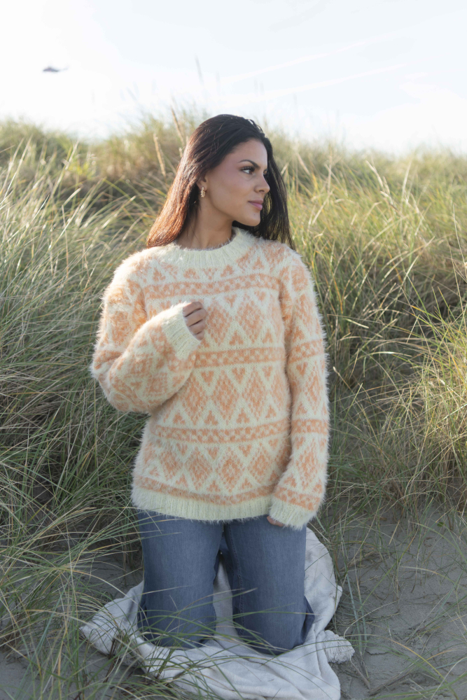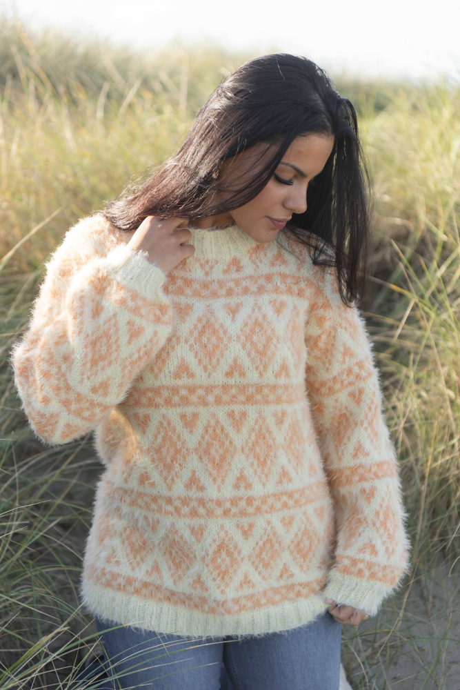 Du kan selv endre farge i strikkepakken ; velg da først størrelsen du ønsker å strikke, så kommer det opp fargevalg nedenfor. NB! Oppskrift vil alltid leveres i strikkepakkens originale farge: Vanilje og Aprikos