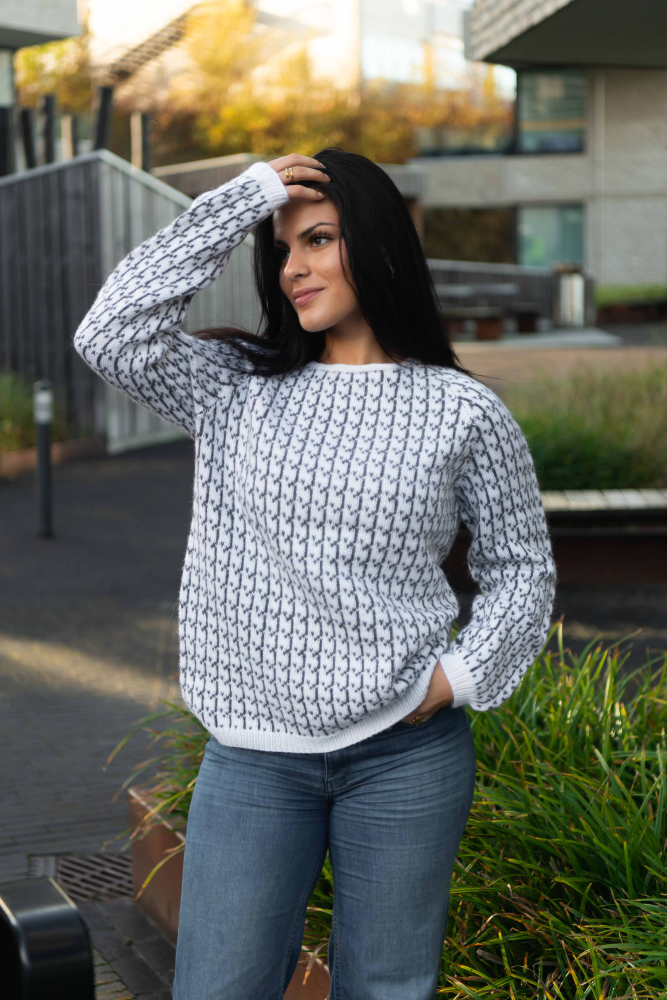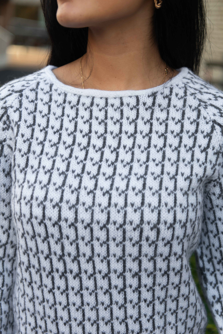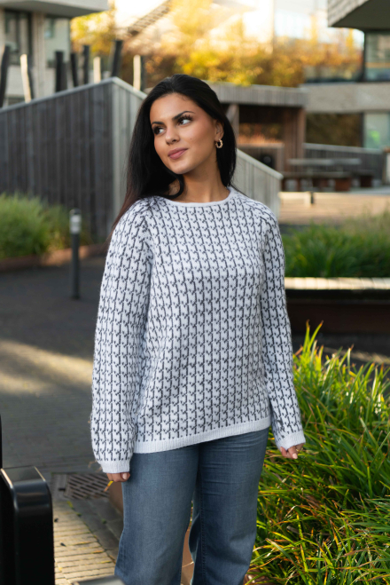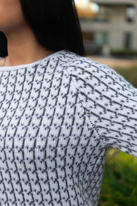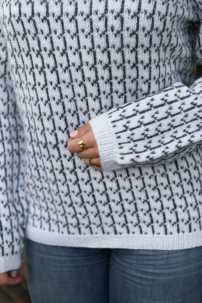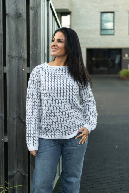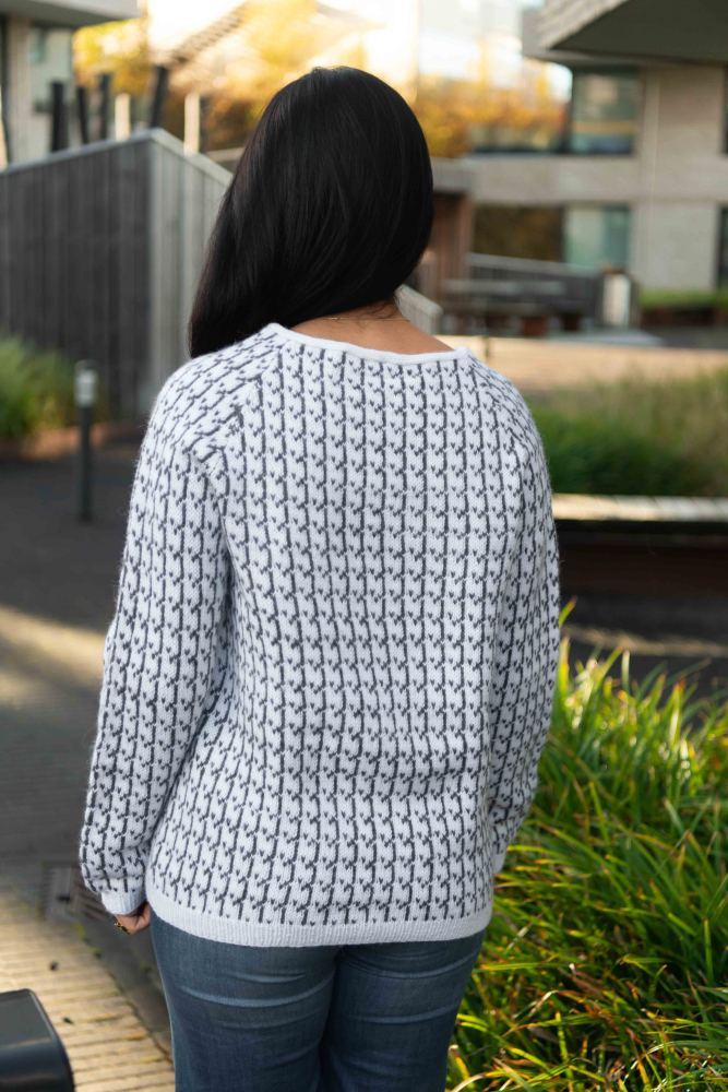 Du kan selv endre farge i strikkepakken ; velg da først størrelsen du ønsker å strikke, så kommer det opp fargevalg nedenfor. NB! Oppskrift vil alltid leveres i strikkepakkens originale farger: Hvit og Koksgrå