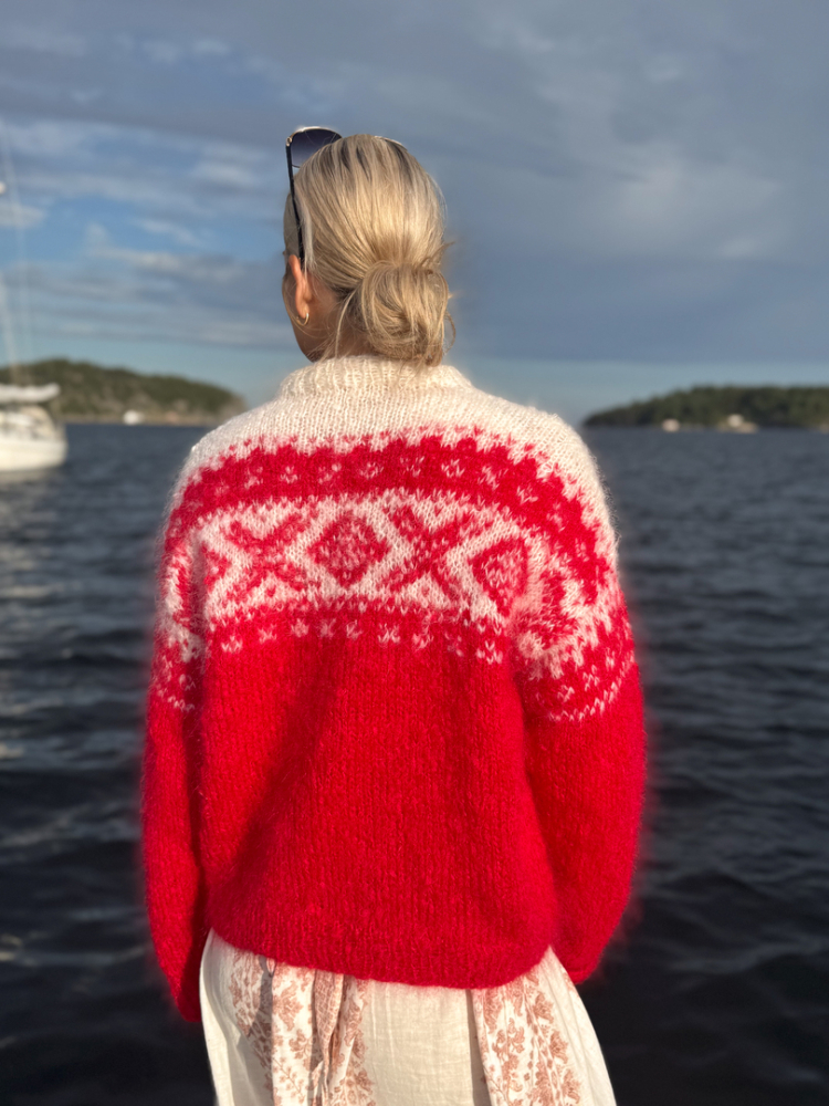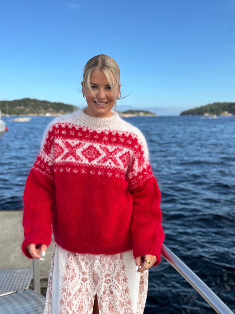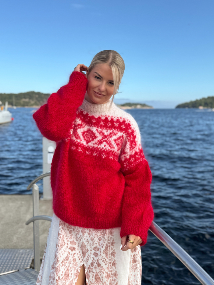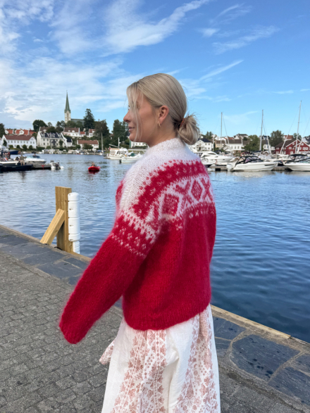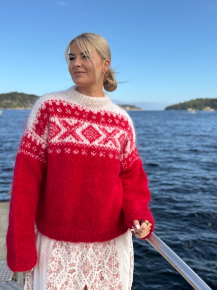 Du kan selv endre farge i strikkepakken ; velg da først størrelsen du ønsker å strikke, så kommer det opp fargevalg nedenfor. NB! Oppskrift vil alltid leveres i strikkepakkens originale farge: deep red og white