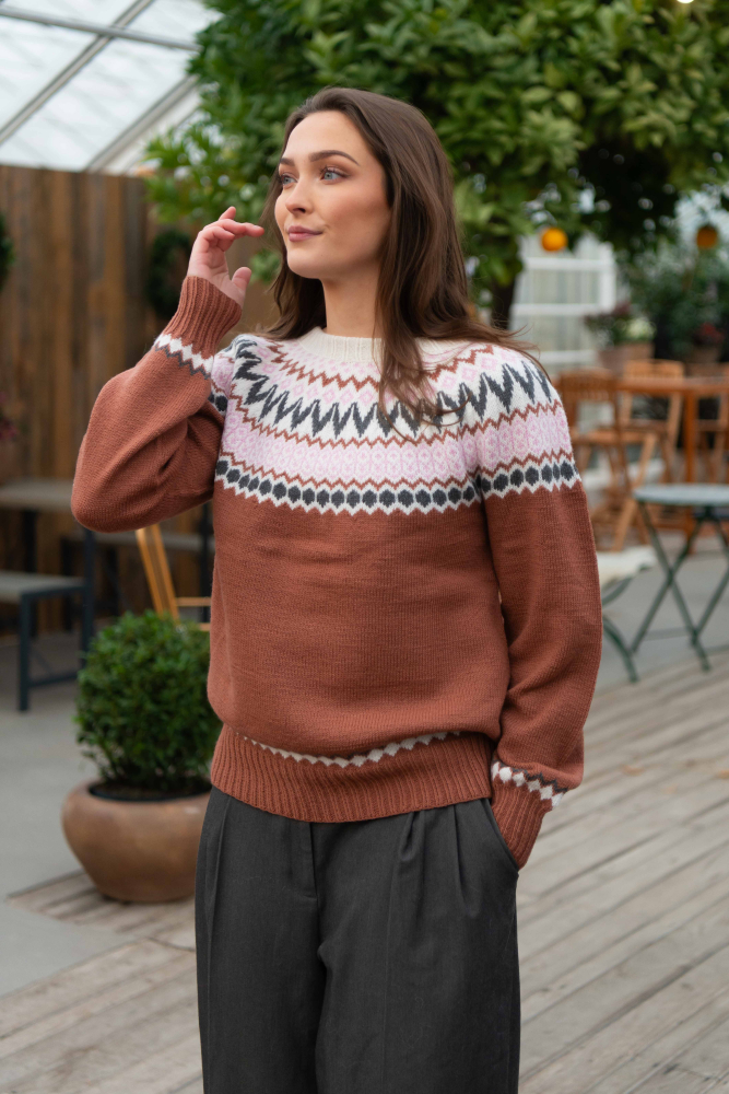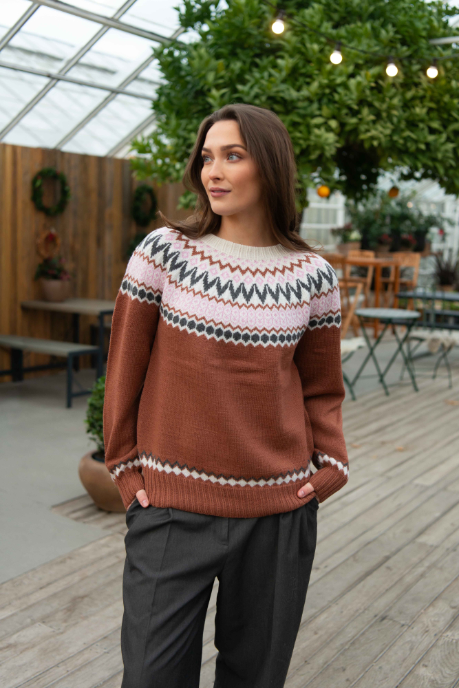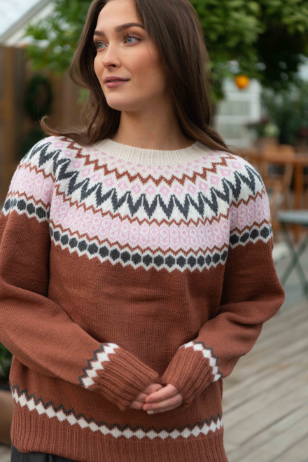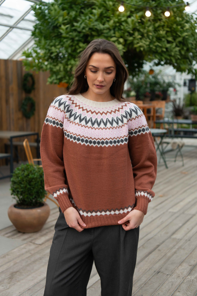 Du kan selv endre farge i strikkepakken ; velg da først størrelsen du ønsker å strikke, så kommer det opp fargevalg nedenfor. NB! Oppskrift vil alltid leveres i strikkepakkens originale farger: Mocca Mousse, Natur, Koksgrå og Rosa Tåke