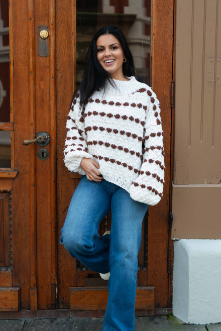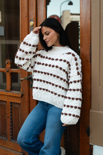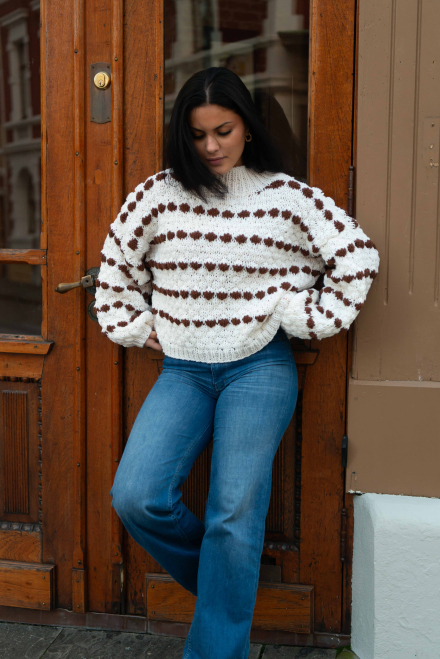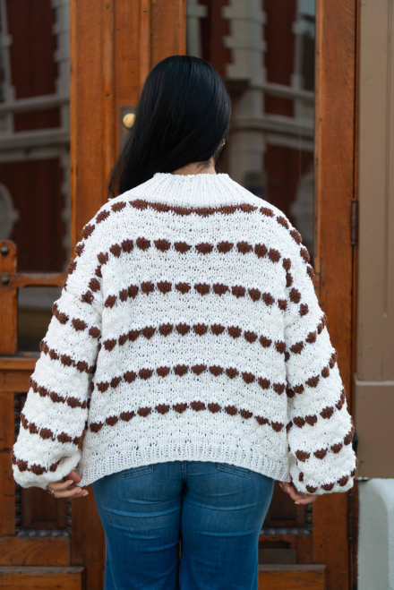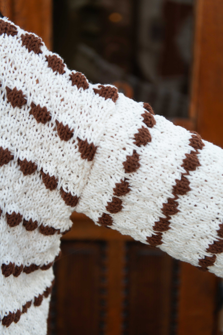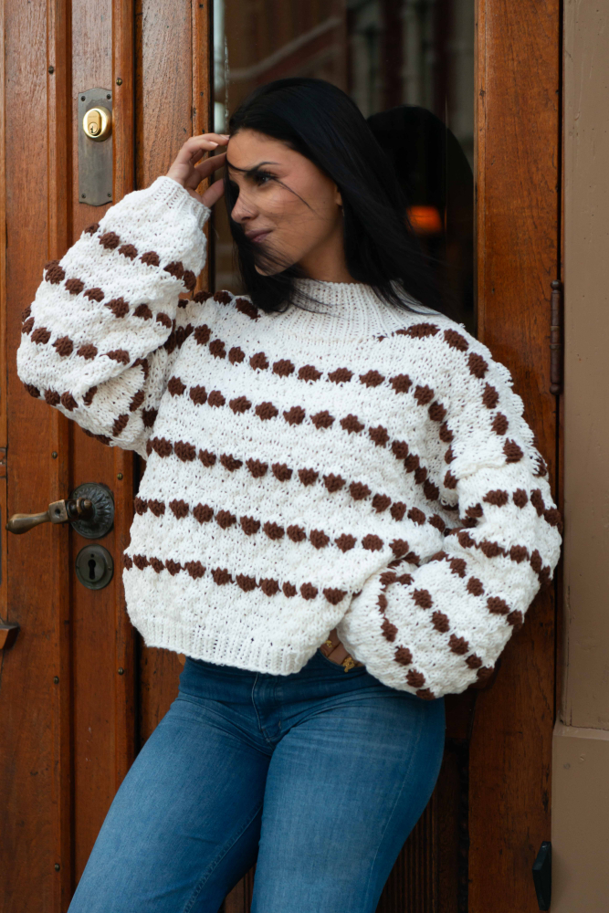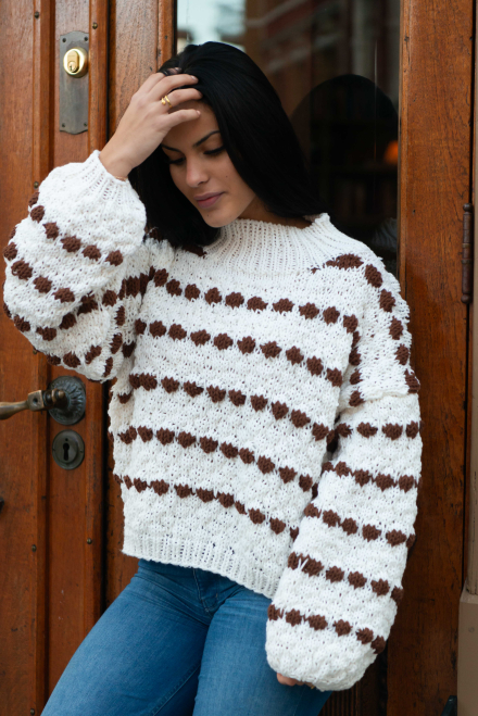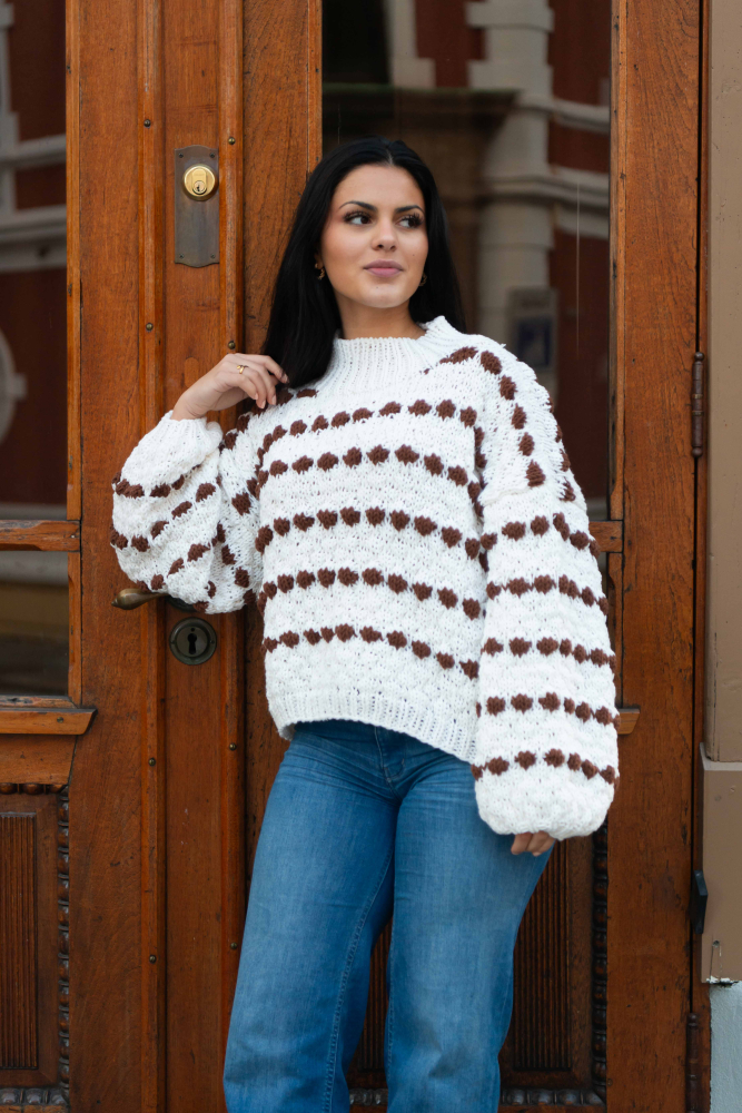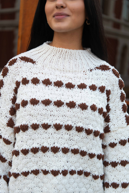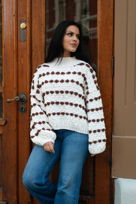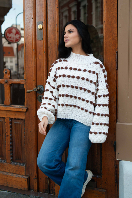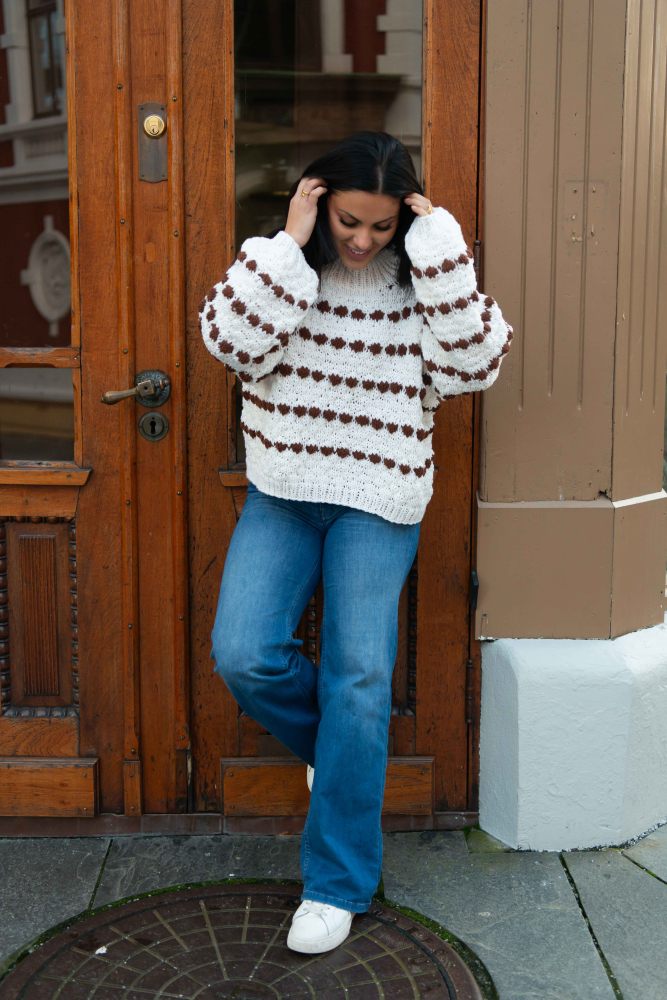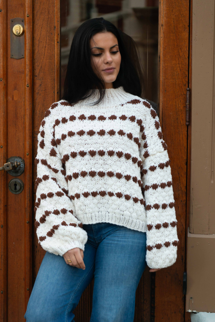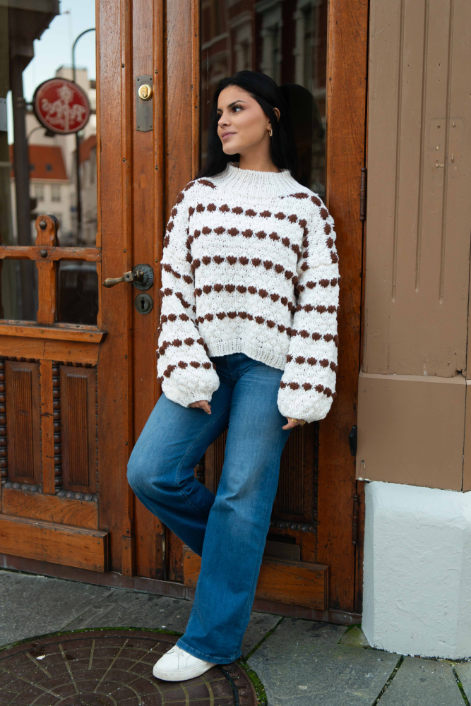 Du kan selv endre farge i strikkepakken ; velg da først størrelsen du ønsker å strikke, så kommer det opp fargevalg nedenfor. NB! Oppskrift vil alltid leveres i strikkepakkens originale farger: Hvit og Capuccino
