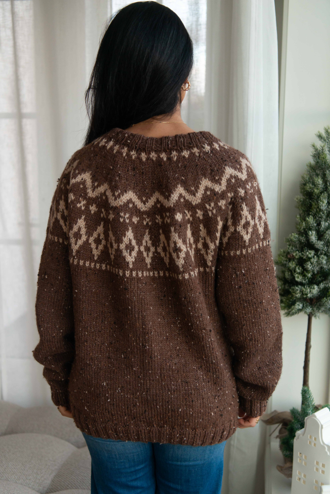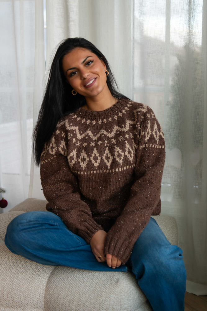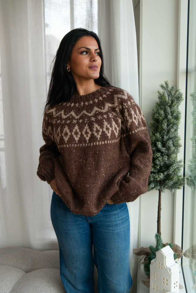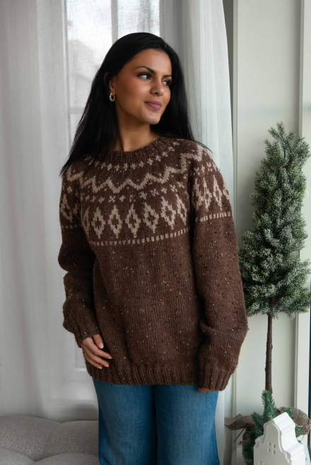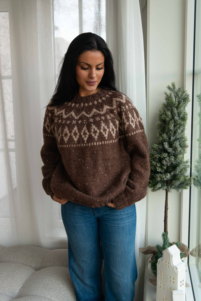 Du kan selv endre farge i strikkepakken ; velg da først størrelsen du ønsker å strikke, så kommer det opp fargevalg nedenfor. NB! Oppskrift vil alltid leveres i strikkepakkens originale farger: Brun og Lys Beige