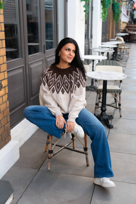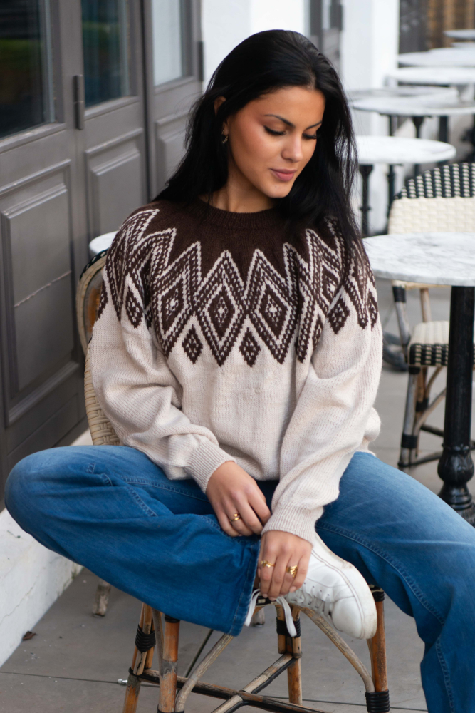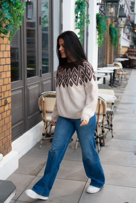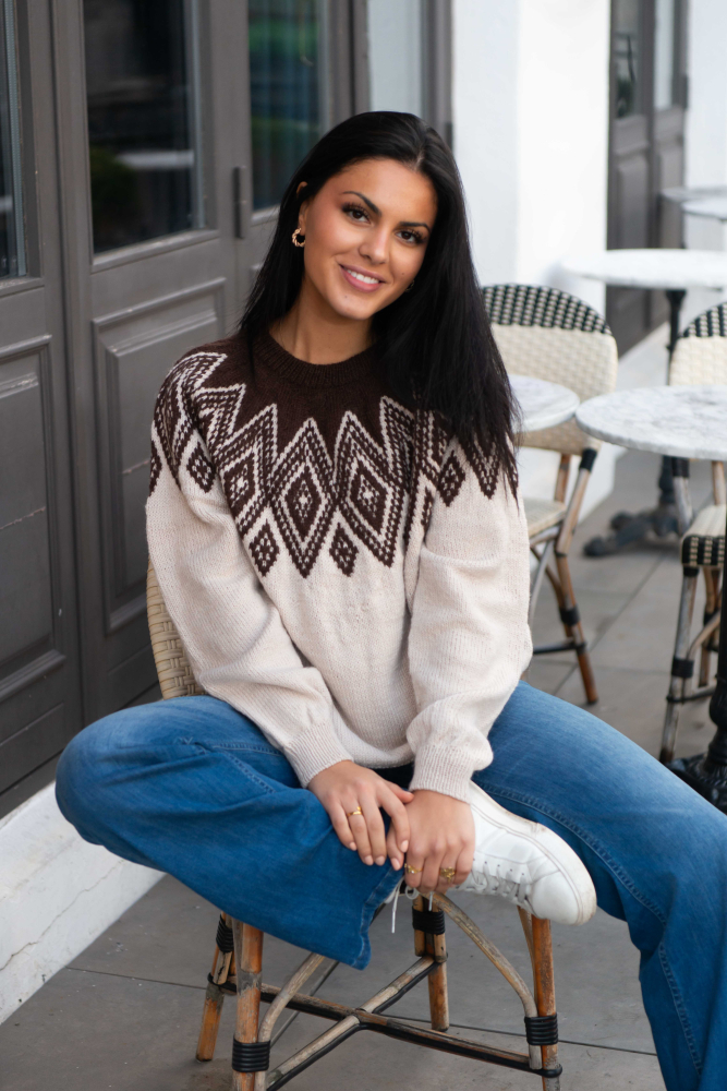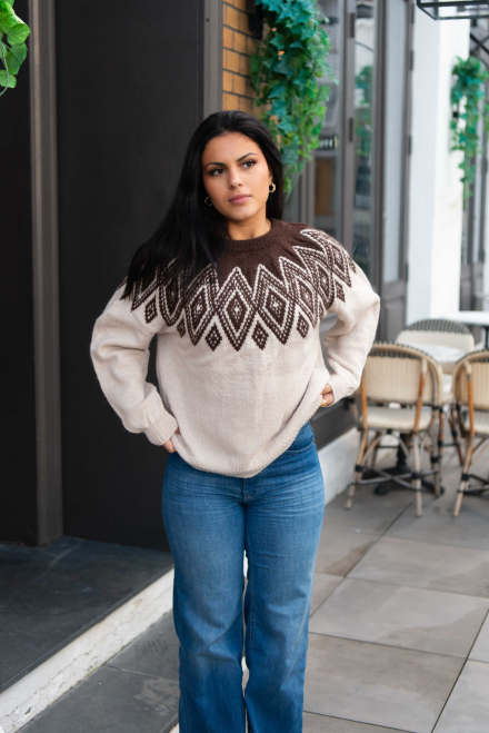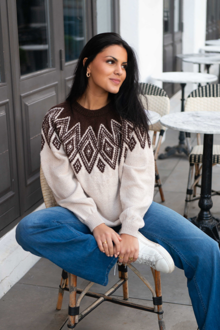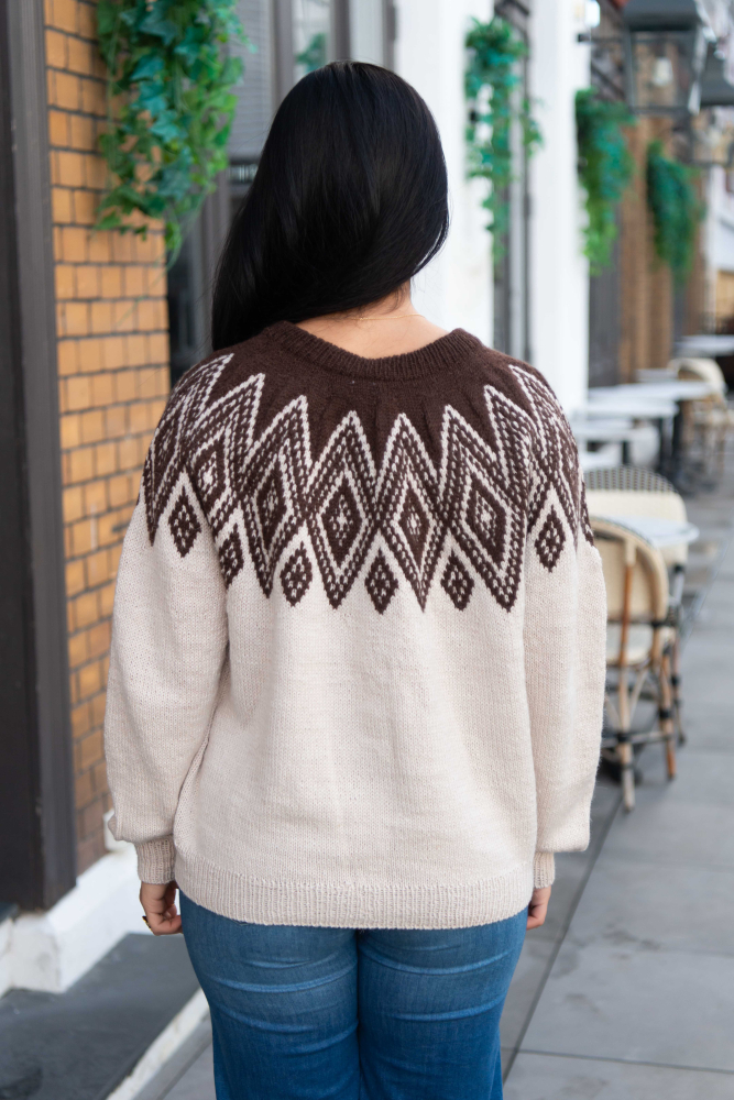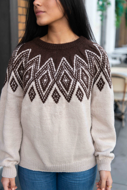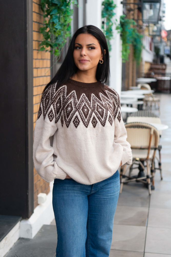 Du kan selv endre farge i strikkepakken ; velg da først størrelsen du ønsker å strikke, så kommer det opp fargevalg nedenfor. NB! Oppskrift vil alltid leveres i strikkepakkens originale farge: Mørk Brun og Lys Beige Melert