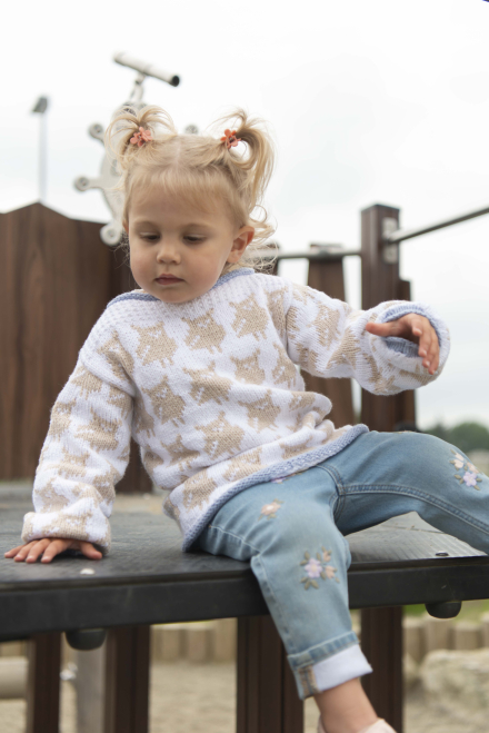 Du kan selv endre farge i strikkepakken ; velg da først størrelsen du ønsker å strikke, så kommer det opp fargevalg nedenfor. NB! Oppskrift vil alltid leveres i strikkepakkens originale farge: Lys Beige, Hvit og Lys Blå