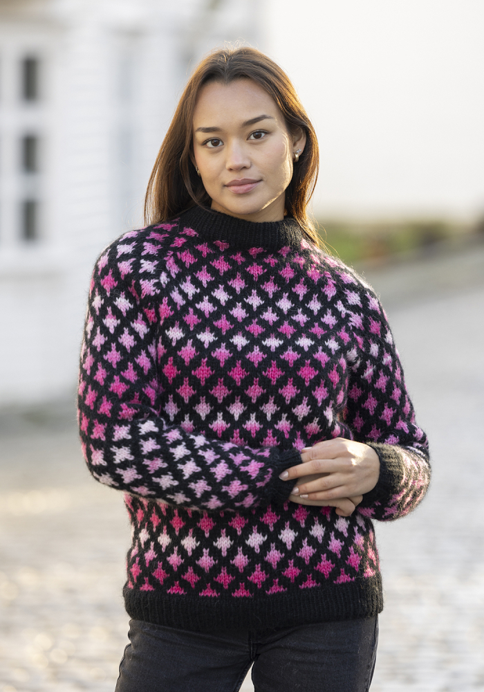 Du kan selv endre farge i strikkepakken ; velg da først størrelsen du ønsker å strikke, så kommer det opp fargevalg nedenfor. NB! Oppskrift vil alltid leveres i strikkepakkens originale farge: Svart og Multi Rosa